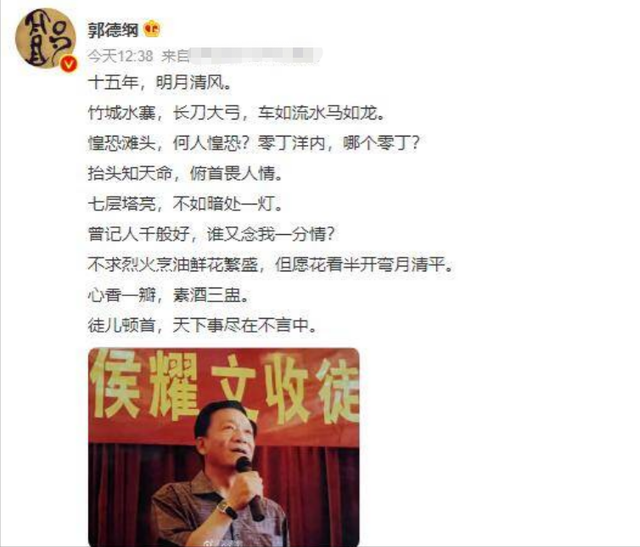 那么侯耀文死一火15年,郭德纲甘心帮他照顾男儿,自后作念到了吗? 3年师徒心扉 在德云社,扫数东谈主齐知谈侯耀文对于郭德纲来说,有多蹙迫。 在阿谁认真实宗地位的年代,半谈披缁的郭德纲,从未被任何东谈主采用,除了侯耀文。 确立相申明门的侯耀文,主动风物收郭德纲为徒,为他的相声路添砖加瓦。